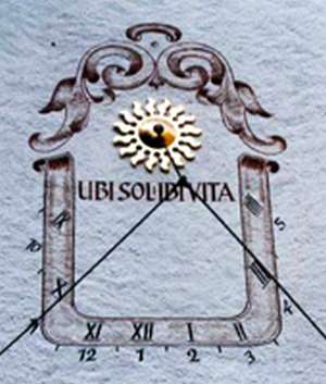 :: DESCRIPCIÓ: Policromat pintat a la paret sobresurt sol incrustat.Doble numeració romans i àrabs. Filigranes