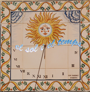 :: DESCRIPCIÓ: Composició vertical de rajoles de ceràmica (4x4), declinant de tarda, sense línies, números romans (de V a IV), gnòmon (15 cms) vareta, elevació 99 mts., decorat amb un sol al pol