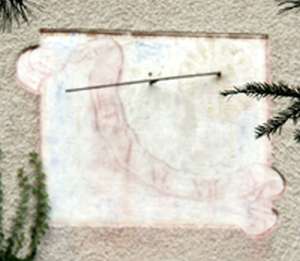 :: DESCRIPCIÓ: Situat a la façana d’un xalet esta bastant deteriorat, queda el gnòmon però de la decoració sols hi han restes. S'endevinen números romans (de VIII a XII ?)