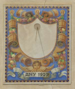 :: DESCRIPCIÓ: Dins un rectangle amb decoració de guirnaldes, flors i fruits, un rellotge en forma d'escut sense xifres ni línies horàries, possiblement a causa d'una restauració. Un angelet i l'any en la part inferior.