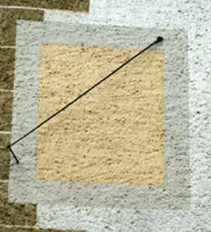 :: DESCRIPCIÓ: Senzill rellotge quadrat, format per dos quadres de diferent color, sense números ni línies horàries