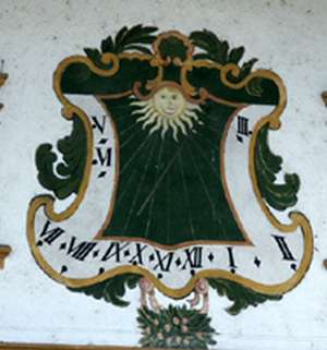 :: DESCRIPCIÓ: Bonic rellotge decorat, situat a la façana d’un xalet a la part baixa del carrer. Números romans (de V a III), molt declinat, línies de les hores