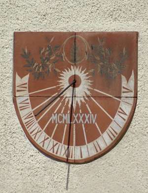 :: DESCRIPCIÓ: Semicircular composat amb 4 rajoles de fang cuit i decoració de branquetes d'arbust de la zona. Xifres romanes i línies horàries, senyalant de les 6 del matí a les 5 de la tarda.