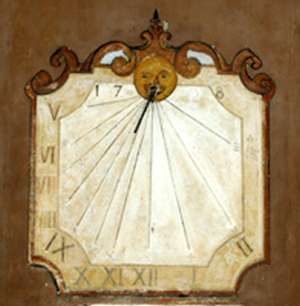 :: DESCRIPCIÓ: Quadrat, decorat, situat al lateral de la petita capella que hi ha al peu del castell de La Bathiaz. Números romans (de V a III), línies horàries
