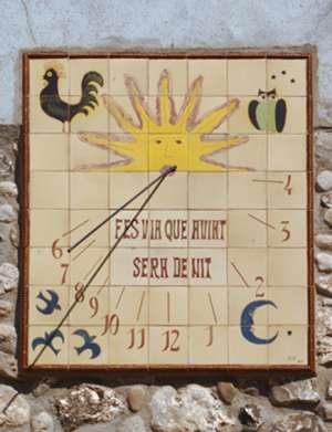 :: DESCRIPCIÓ: Rectangular amb una cara sol tallada a ras de boca d'on surt el gnòmon, la seva decoració la formen el gall, el mussol, orenetes i la lluna. Amb xifres aràbigues i línies horàries assenyala de 6 del matí a 4 de la tarda.