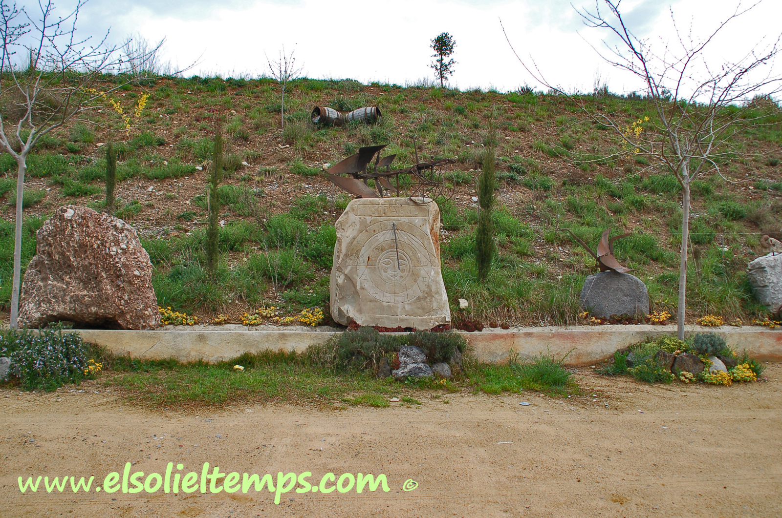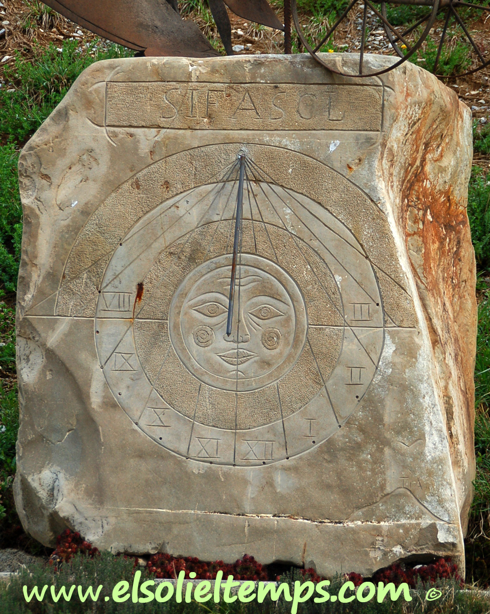 :: DESCRIPCIÓ: Vertical meridional, gravat en un bloc de pedra, circular, línies horàries, punts a les mitges hores, números romans (de VIII a III), gnòmon (50 cms) polar, es belluga, lema, elevació 186 mts. snm.