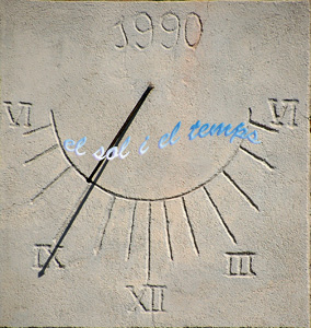 :: DESCRIPCIÓ: Vertical declinant de matí, gravat al ciment, línies horàries, números romans (VI, IX, XII, III i VI), gnòmon (30 cms.) acabat en boleta, datat, elevació 100 mts.
