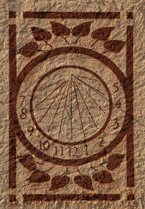 :: DESCRIPCIÓ: Vertical meridional, circular dins un rectangle amb decoracions florals, línies horàries, números àrabs (de 7 a 5), gnòmon (50 cms) vareta