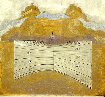 :: DESCRIPCIÓ: Sense línies horàries, indica les línies de declinació del sol calculades amb intervals de 10 dies, des del 21 de juny fins al 21 de desembre, gnòmon orto