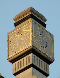 :: DESCRIPCIÓ: Conjunt de quatre quadrants, el del SW, línies horàries, calendari zodiacal, signes del zodíac, números romans (de IX a XXI), gnòmon (60 cms) recolzat i amb bola al mig, les hores representades amb línies daurades i les dates amb línies platejades