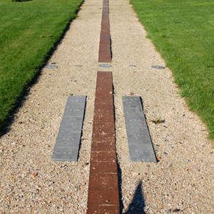 :: DESCRIPCIÓ: Horitzontal analemàtic composat per peces de pedra sobre una línia que segueix l'eix del meridià local, números àrabs (de 4 a 8), el gnòmon es el cos de la persona que es posa sobre la data a la placa calendari central