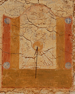:: DESCRIPCIÓ: Vertical meridional, molt malmès, s'endevinen restes de línies horàries i alguna inscripció, gnòmon (50 cms) polar