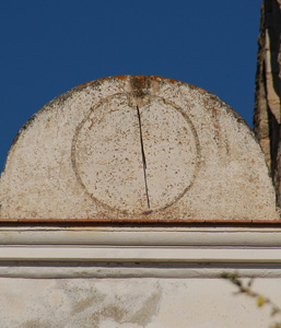 :: DESCRIPCIÓ: Vertical meridional, circular, no queda decoració, ni línies ni numeració, gnòmon (40 cms) polar