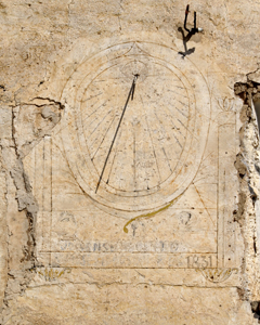 :: DESCRIPCIÓ: Ovalat, amb línies horàries i senyals per les mitges hores. La numeració no s'aprecia