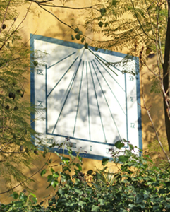 :: DESCRIPCIÓ: Rellotge quadrat amb línies horàries i numeració romana que assenyalen de les 9 del matí a les 6 de la tarda