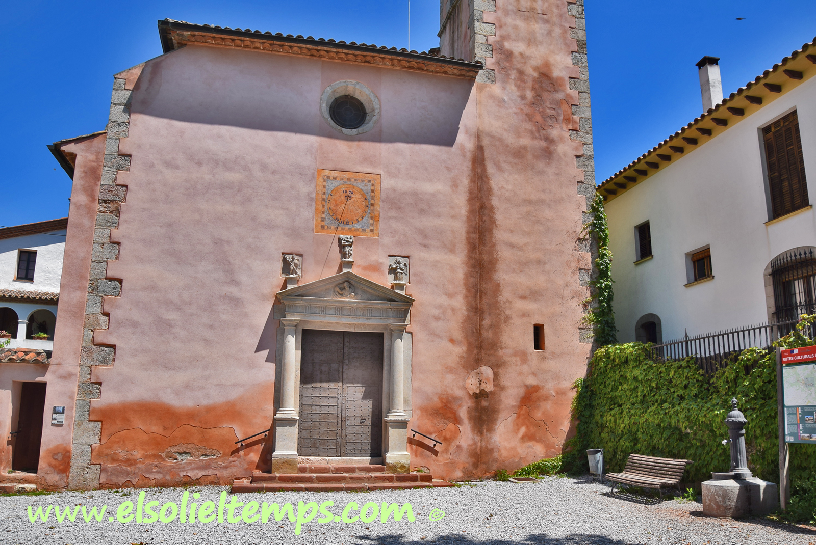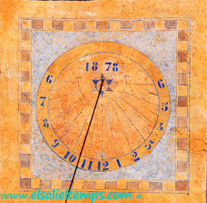 :: DESCRIPCIÓ: Vertical circular dins un quadrat, lleugerament orientat a matí, línies horàries i mitges hores curtes, la del migdia fletxada, números àrabs (de 6 a 6) en corona, gnòmon (60 cms) vareta, datat, elevació 400 mts. snm.