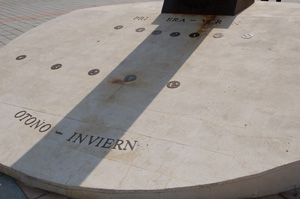 :: DESCRIPCIÓ: Horitzontal inclinat, hora oficial, doble horari (estiu-hivern), sense linies, numeros arabs (de 4 a 10) cercles de ferro inserits a la base (en falten alguns), gnomon (3 mts) molt ample en forma de canó, signat i datat