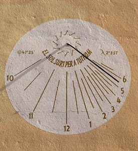 :: DESCRIPCIÓ: Vertical de tarda, circular, línies horàries i mitges hores més curtes, números àrabs (de 10 a 6), gnòmon (80 cms) acabat en boleta