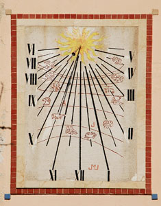 :: DESCRIPCIÓ: Vertical quasi meridional, línies horàries i mitges hores més curtes, línies zodiacals, signes del zodíac, números romans (de VI a V), gnòmon (30 cms) polar amb una boleta al mig per marcar el calendari
