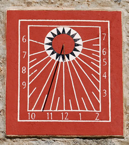 :: DESCRIPCIÓ: Vertical meridional, línies horàries i mitges hores més curtes, números àrabs (de 6 a 7), gnòmon (40 cms), mal construït ja que el dibuix de les línies no es correspon amb l'orientació de la paret