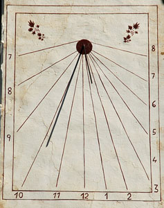 :: DESCRIPCIÓ: Vertical de tarda, línies horàries, números àrabs (de 7 a 8) en marc, gnòmon (30 cms) polar