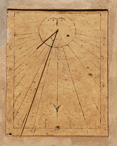 :: DESCRIPCIÓ: Vertical de mati, línies horàries marcades a la pedra, mitges hores més curtes, la línia de les 12 fletxada, números àrabs (de 5 a 4), gnòmon (30 cms) polar