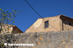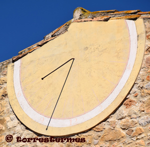 :: DESCRIPCIÓ: Vertical de matí, semicircular, sense línies horàries, s'endevina restes de numeració aràbiga (6, 9, 12,...) en corona, gnòmon (50 cms.) acabat en boleta, elevació 19 mts.
