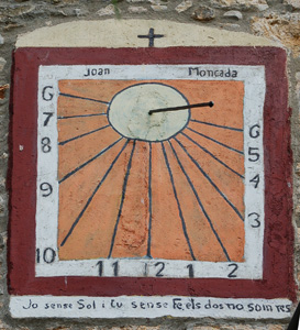 :: DESCRIPCIÓ: Vertical, lleugerament de tarda, línies horàries, números àrabs (de 6 a 6) en marc, gnòmon (40 cms) acabat en boleta, signat