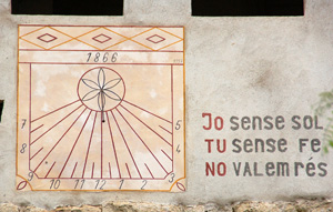 :: DESCRIPCIÓ: Vertical meridional, línies horàries i mitges hores més curtes, números àrabs (de 7 a 5) en marc, gnòmon (40 cms) acabat en boleta, datat, lema extern al quadrant