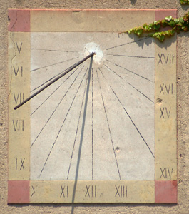 :: DESCRIPCIÓ: Vertical de matí, línies horàries, números romans (de V a XVIII) en marc, gnòmon (60 cms) vareta
