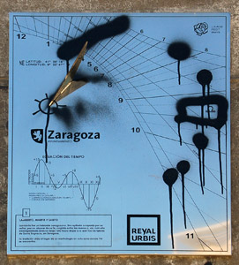 :: DESCRIPCIÓ: Vertical de tarda, línies horàries, mitges hores i quarts, línies i signes zodiacals, doble numeració aràbiga (de 12 a 11 i de 5 a 8), gnòmon (15 cms) triangular, signat i datat, equació del temps, declinació i coordenades