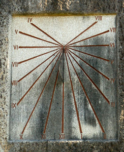 :: DESCRIPCIÓ: Vertical meridional, línies horàries, números romans (de IV a VIII), gnòmon (20 cms) triangular