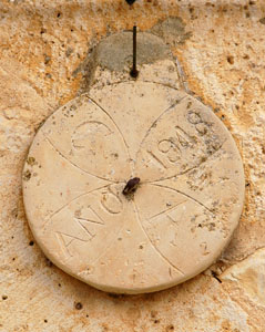 :: DESCRIPCIÓ: Vertical circular, lleugerament de matí, línies corbes, restes de numeració aràbiga (..12,1,2,3,..), gnòmon (15 cms) vareta, sembla que es més decoratiu que funcional i el gnòmon està tort, signat i datat