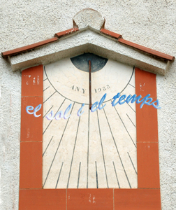 :: DESCRIPCIÓ: Vertical declinant a ponent, línies horàries i mitges hores més curtes, números romans (de VII a V) en marc, molt esborrats, datat, gnòmon (50 cms.) acabat en bola, elevació 116 mts.