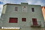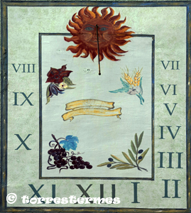 :: DESCRIPCIÓ: Vertical meridional, sense línies horàries, números romans (de VIII a VII) en marc, gnòmon (50 cms) acabat en bola, decorat amb elements florals i un sol amb figura humana al pol, lema esborrat en una cinta, elevació 60 mts. snm.
