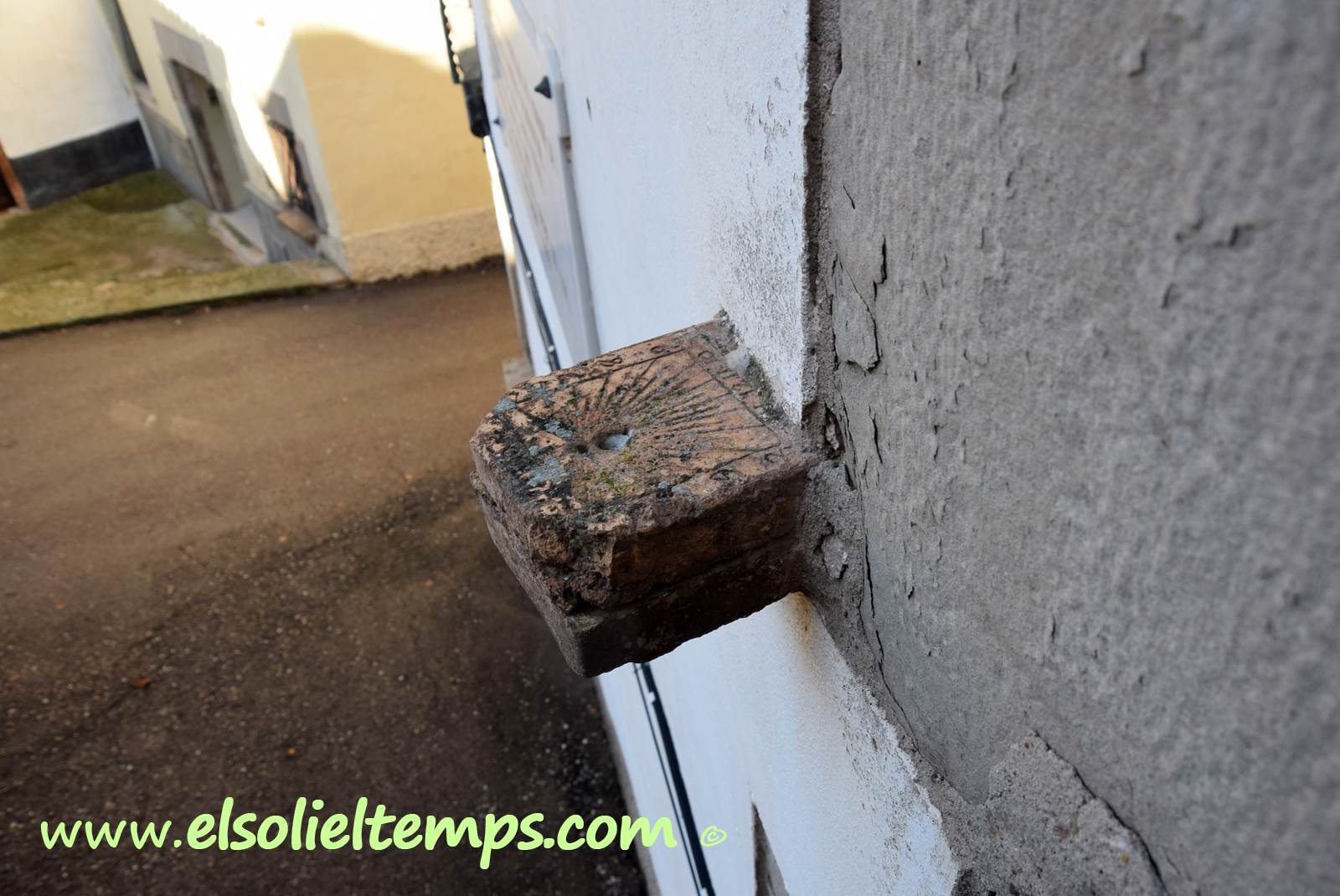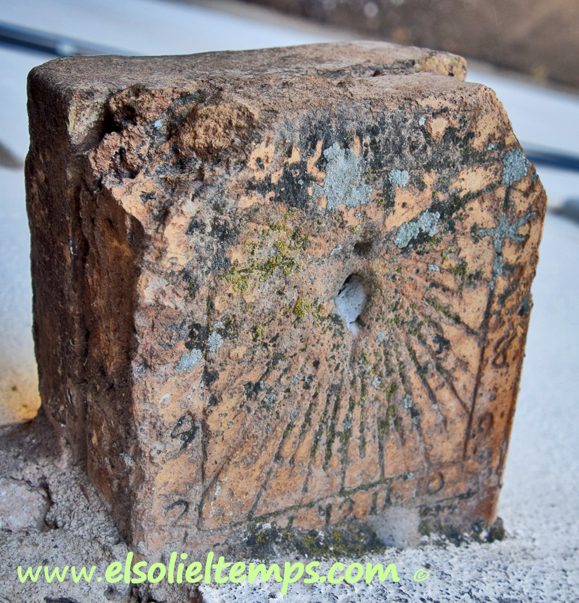 :: DESCRIPCIÓ: Rellotge de balcó, rectangular, gravat sobre pedra, línies horàries, numeració aràbiga (de 6 a 6) en marc, gnòmon absent, elevació 465 mts. snm.