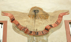 :: DESCRIPCIÓ: Vertical lleugerament de matí, línies horàries i mitges hores més curtes, números romans (de VIII a IV) en banda, gnòmon (40 cms) recolzat, decorat amb el triangle i l'ull que representen Deu, al pol