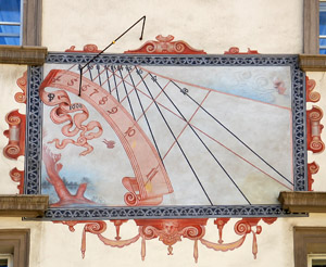 :: DESCRIPCIÓ: Vertical força declinant de matí, línies horàries, doble numeració aràbiga, hora local (de 4 a 11) en banda, hores itàliques (de 9 a 18), gnòmon (30 cms) doble recolzament i bola al mig, signat i datat
