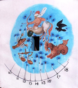 :: DESCRIPCIÓ: Vertical circular quasi meridional, molt decorat amb figures del zodíac, línies horàries, números àrabs (de 10 a 18), gnòmon (30 cms) tort
