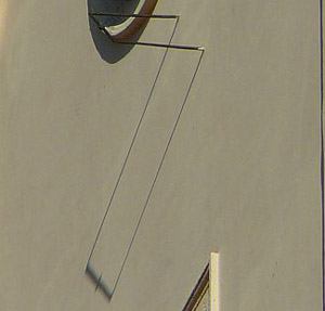:: DESCRIPCIÓ: Restes d'un rellotge vertical de tarda, sols resta el gnomon (40 cms) doble recolzament i bola al mig