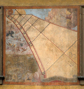 :: DESCRIPCIÓ: Vertical declinant a llevant, línies horàries, equatorial, signes del zodíac, numeració àrab (de 4 a 11), gnòmon (30 cms) orto, acabat en bola, lema llatí bastant difícil de llegir