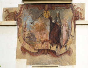 :: DESCRIPCIÓ: Vertical de mati rectangular, molt decorat amb pintura barroca, línies horàries, números romans (de VII a IV) en una banda, gnòmon (50 cms) recolzat i amb bola al mig