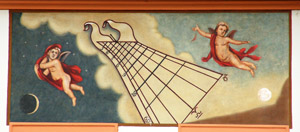 :: DESCRIPCIÓ: Vertical rectangular, declinant a llevant, línies horàries i zodiacals, números àrabs (de 5 a 10), gnòmon (25 cms) orto, decoració barroca