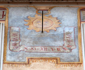 :: DESCRIPCIÓ: Vertical de mati, forma part de la decoració pictòrica de la façana, sense línies, números romans (de VI a VI), gnòmon (50 cms) polar