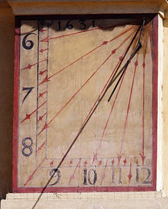 :: DESCRIPCIÓ: Parella de rellotges quasi meridionals, el de la dreta marca les hores del matí, línies horàries, números àrabs (de 6 a 12) en marc, gnòmon (1 mt) recolzat, datat