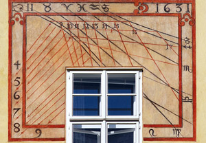 :: DESCRIPCIÓ: Vertical rectangular de matí, curiosa disposició de la decoració per salvar l'obstacle de la finestra, línies horàries i mitges hores fletxades, línies zodiacals, números àrabs (de 4 a 17) gnòmon absent, datat, símbols del zodíac