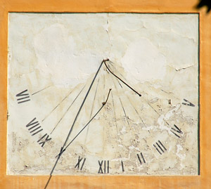 :: DESCRIPCIÓ: Vertical lleugerament declinant de tarda, línies horàries, números romans (de VII a V), gnòmon (50 cms) recolzat i acabat en bola, trencat