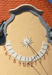 :: DESCRIPCIÓ: Vertical circular lleugerament de matí, línies horàries curtes i en corona, números àrabs (de 5 a 5), gnòmon (50 cms) recolzat