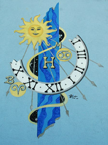 :: DESCRIPCIÓ: Vertical declinant a ponent, artístic, línies horàries fletxades, números romans (de X a IV), gnòmon absent