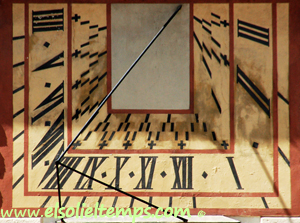 :: DESCRIPCIÓ: Vertical rectangular, força declinant a matí, línies horàries i marques a les mitges hores, números romans (de IIII a III) en marc, gnòmon (100 cms.) doble recolzament, elevació 195 mts. snm.